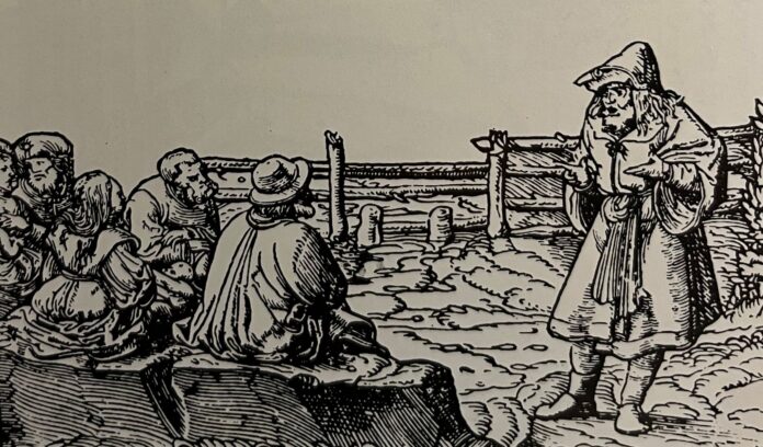 Immagine: Un “predicatore clandestino” anabattista. Incisione su legno del 1534. Immagine tratta dalla Storia dell’anabattismo vol.1 Dalle origini a Münster (1525-1535) di Ugo Gastaldi, ed. Claudiana